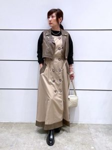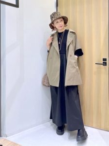インナーには落ち着いたカラーの「ワンピース」を合わせることで、シンプルながらも洗練された印象を醸し出しています。
