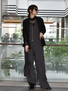 黒を基調としたスタイリッシュなサロペットコーデは、かっこいい大人女子のクール系ファッションにぴったり。シンプルながらもジャケットを合わせることでフォーマルな印象を加え、落ち着いた大人の雰囲気を演出しています。