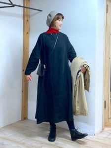 このコーディネートの特徴として、重ね着がポイントになっています。ハイネックのインナーをワンピースの下に重ねることで、シンプルなワンピースのスタイルに深みと奥行きを加えています。