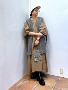 ボリュームのあるブラウン系のワンピースは落ち着いたカラーで、大人の女性らしい洗練された雰囲気を醸し出しています。また、グレーのベストを重ねることで、秋冬の季節感と立体感をプラス。