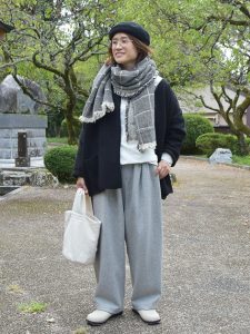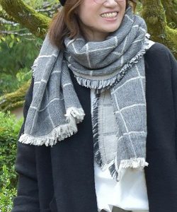 このようにチェック柄のストールを使用することで、シンプルな服装に程よいアクセントを加え、視覚的なバランスを取ることができます。