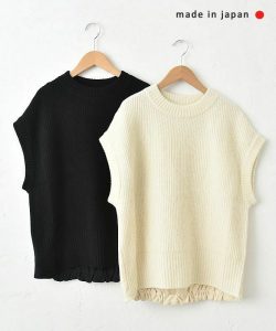 ニットベストの「切り替え」デザインがシンプルながらも立体感を演出し、アクセントを添えています。