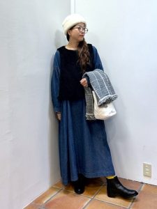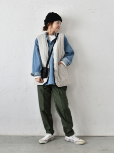 デニムシャツと薄手のベストを重ねることで、秋冬らしい温かみをプラスしつつ、重たくならない軽快なレイヤードスタイルを実現しています。