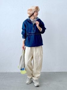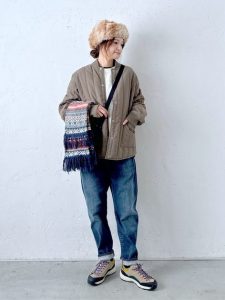 足元にはスニーカーが選ばれており、アクティブで若々しい雰囲気をプラス。帽子はファー素材で、季節感をプラスしつつ、柔らかさを演出している点が魅力です。