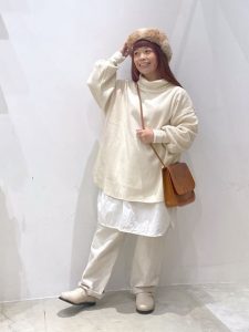 こちらは秋冬らしい温かみを感じさせるアイボリーホワイトのワントーンコーディネートです。