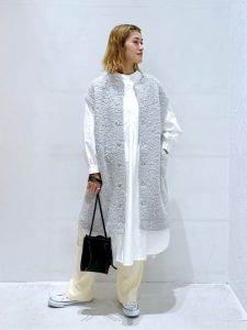 白い「ニットベスト」がトップスとして重ね着され、柔らかい印象を与えます。
