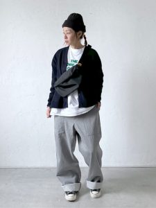 こちらはカーディガンをメインにしたメンズライクなスタイリングです。