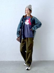 デニムジャケットと合わせることで、季節感のあるメンズライクな雰囲気が引き立ちます。