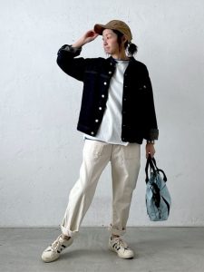 パンツは同じく白系で統一し、足元のスニーカーもホワイトを選んで軽やかさを加えています。