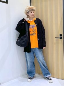 黒のカーディガンに、ビビッドなオレンジのプリントTシャツが組み合わされており、シンプルながらも色のコントラストが印象的です。