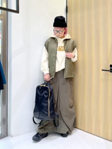 メインアイテムである「ボアアイテム」と「コンバットキャップ(ボア)」が全体の雰囲気を引き立て、季節感と個性をプラスしています。