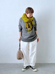 落ち着いたグレーのニットトップスがベースとなり、全体にシンプルで洗練された雰囲気を作り出しています。これにホワイトのゆったりとしたパンツを合わせることで、明るく清潔感のあるバランスを保ち、軽やかさが演出されています。