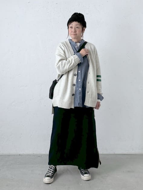 暖かいカーディガンと楽ちんコーデの定番スウェットの組み合わせは、冬の特別なシーンにも使えるコーディネート。ヒールのあるパンプスを選ぶことで、エレガントさがさらに引き立ちます。