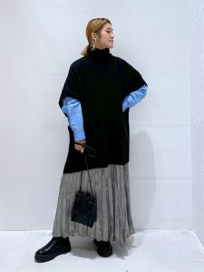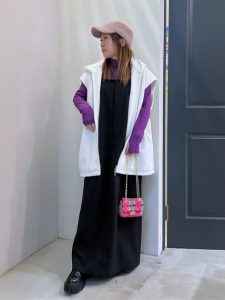 軽量で暖かいダウンベストにマキシスカートを合わせたスタイルは、フェミニンさと機能性を兼ね備えています。インナーにタートルネックセーターを取り入れて、冬らしいスタイリングに仕上げましょう。