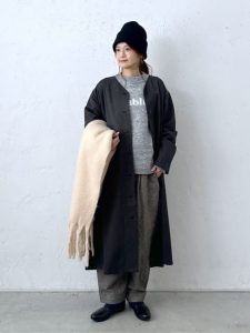 ノーカラーコートは、首元をすっきり見せる効果があり、女性らしさを引き立てます。ボールパンツと組み合わせることで、上品で洗練されたスタイルが完成します。また襟がないのでマフラーなどのアイテムも使いこなしやすくなります。