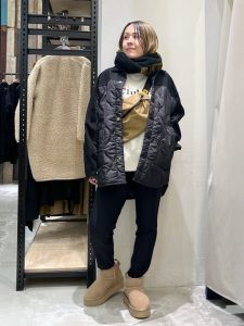 ボアジャケットは、冬のマストアイテム。スリムデニムと合わせることで、全体のシルエットをすっきりと見せることができます。また足元にはスニーカーを選び、動きやすさとカジュアル感をプラスしましょう。