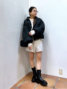 ショート丈のダウンジャケットは、デニムと合わせることでカジュアルなコーディネートに仕上がります。スニーカーを合わせれば、アクティブな雰囲気をプラスできます。