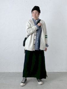 スタジャンにプリーツスカートを合わせたスタイルは、シンプルながらも動きのあるシルエットが特徴。インナーにはタイトなニットを選び、全体のバランスを整えましょう。