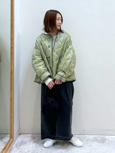 キルティングジャケットとデニムスカートを合わせたリラックス感のあるコーディネートは、休日のお出かけにぴったり。スニーカーを合わせれば、動きやすさも抜群です。