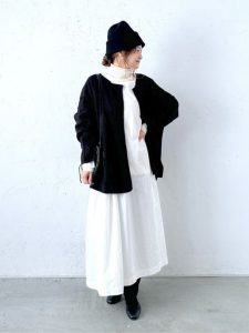 柔らかく温かみのあるブークレ素材の黒カーディガンが、白のロングワンピースとコントラストを作り、シンプルながら洗練された印象を与えています。