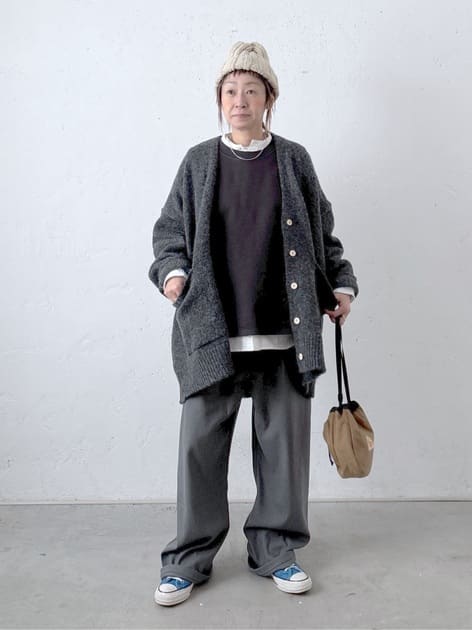 ゆったりとしたシルエットのカーディガンは、体型を気にせず着られるため、年齢を問わず愛用されています。
