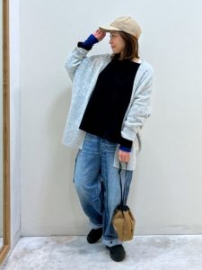 2wayニットカーディガンとデニムパンツで動きのあるスタイリング。