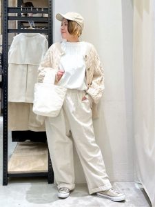 こちらのコーディネートは、ケーブル編みボリュームスリーブカーディガンとホワイトパンツを組み合わせた、軽やかなオールホワイトスタイルです。