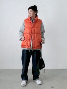 こちらのコーディネートは、スウェットカーディガンとデニムパンツをベースに、鮮やかなオレンジのジップダウンベストを合わせたスタイルです。