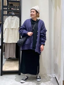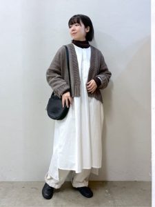 柔らかな質感のシャギーカーディガンが秋冬らしい季節感を演出し、大人らしい落ち着きをプラス。