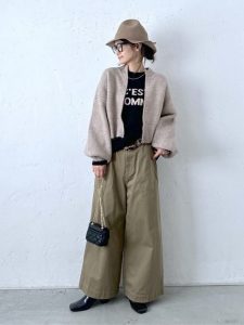 こちらのコーディネートは、クロップドカーディガンとワイドパンツを組み合わせたトレンド感のあるスタイリングです。
