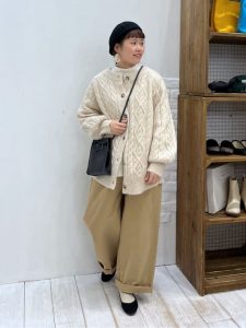 ケーブル編みの立体感が特徴のカーディガンとウール混ワイドストレートパンツを組み合わせ、リラックス感と上品さを両立したナチュラルコーディネート。