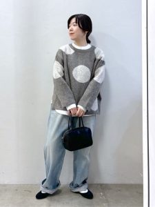 柔らかなグレーに大きなドット柄がアクセントとなり、カジュアルながらも遊び心のある印象に。