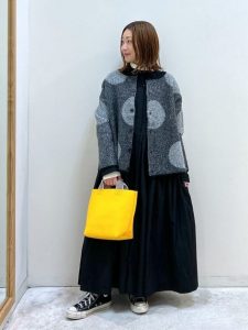 さらに、鮮やかなイエローのバッグが差し色となり、全体を華やかに仕上げています。