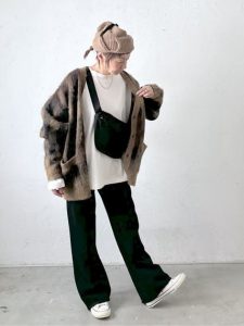 こちらのコーディネートは、ニットカーディガンとタックパンツを組み合わせたリラックス感のあるスタイリングです。