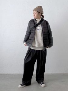 さらに、ブラックのダウンベストを重ねることで防寒性を高めつつ、立体感を演出しています。
