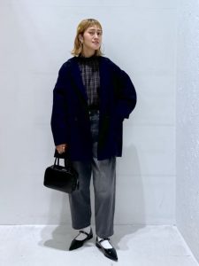 オーバーサイズのダブルジャケットを羽織ることで、マニッシュな雰囲気を加え、トレンド感のあるバランスに仕上げています。