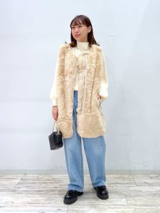 アイボリーカラーのロングジレは、柔らかな質感とふんわりとしたボリューム感が特徴で、冬らしい季節感を引き立てます。
