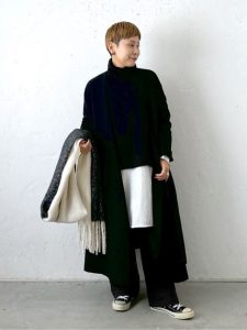 ブラックのロングカーディガンが全体をシックにまとめ、タートルネックセーターの柔らかい質感が冬らしい暖かさを演出しています。