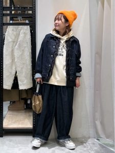 パーカーのナチュラルなカラーが、デニムジャケットのダークトーンと絶妙なバランスを生み出しています。