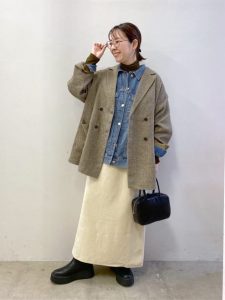 さらに、ベージュのダブルジャケットを羽織ることで、大人っぽさとトレンド感をアップ。