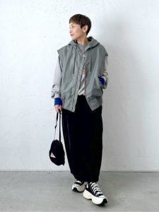 ライトグレーのフード付きベストをレイヤードすることで、立体感と季節感が加わり、軽やかさを演出しています。