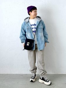 このコーディネートは、デニムジャケットとパーカーの組み合わせがカジュアルで親しみやすい印象を与えます。