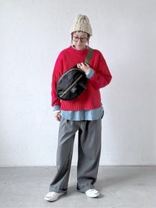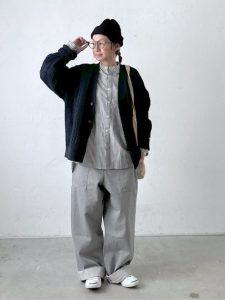 ボトムスにはゆったりとしたグレーパンツを合わせ、リラックス感のあるシルエットを作り出しています。