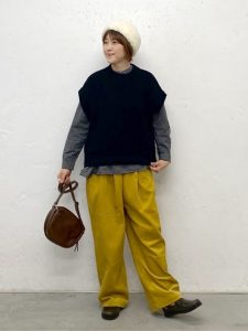 ネイビーのベストをレイヤードすることで、全体に落ち着きを加えつつ、季節感のある温かみを演出しています。