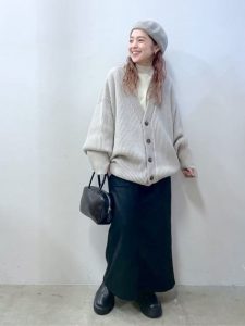 柔らかなベージュトーンのニットカーディガンは、オーバーサイズのシルエットがリラックス感を演出しつつ、きれいめな印象を与えます。