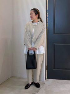 セットアップとして合わせたトップスとニットパンツは、程よいゆとりのあるシルエットで、快適さを保ちながらもスタイリッシュな印象を与えます。