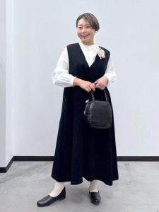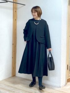 インナーには黒のVネックのワンピースを合わせ、縦のラインを強調することで全体をすっきりと見せています。