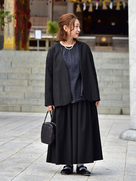 ブラックのバッグとフラットシューズで統一感を出しつつ、リラックス感も添えた、大人の女性らしいセレモニースタイルが完成します。