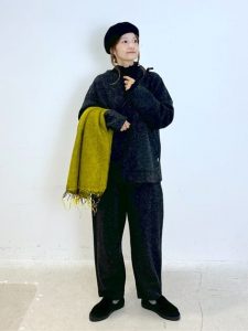 さらに、差し色として取り入れたイエローのストールが、コーディネートに明るさと個性を加えています。