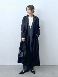 コートとAラインワンピースを合わせることで、縦のラインが強調されてスタイルアップが期待できます。